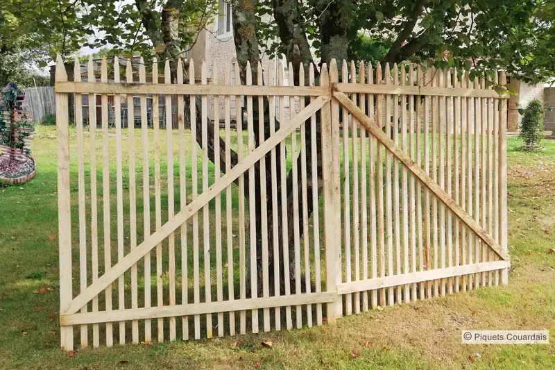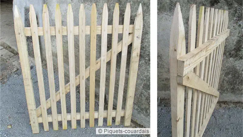 Portillon habillé de lattes pointues, hauteur 1,50 m, largeur 1 m, écart 3-4 cm.